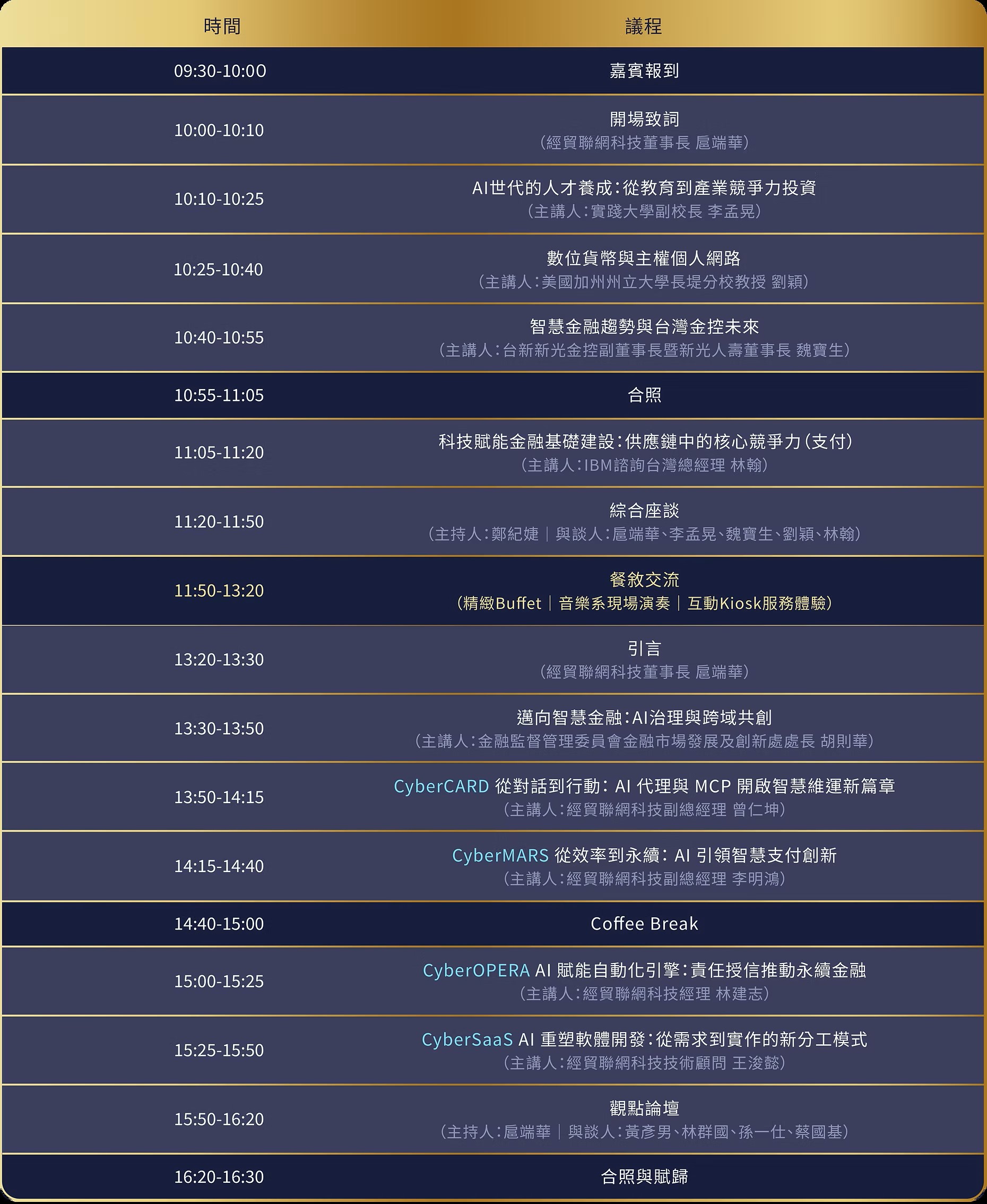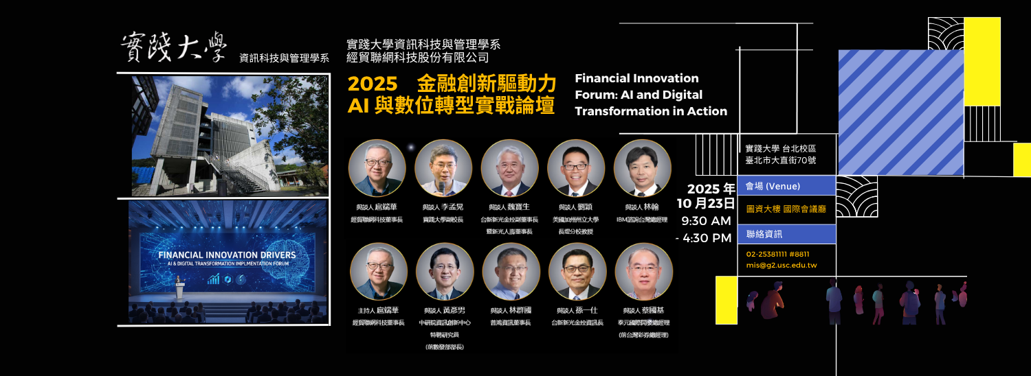 2025 金融創新驅動力 :AI 與數位轉型實戰論壇AI 已成為金融數位轉型的核心引擎本論壇將探討如何以 AI 提升數位金融與資訊管理效率,與前瞻永續金融與智慧應用的發展趨勢。論壇匯聚產官學界與支付產業代表,分享實戰經驗與產業洞見,協助您掌握 AI 賦能下的競爭優勢與創新契機。舉辦時間:2025年10月23日 09:30-16:30舉辦地點:實踐大學 N棟B2 國際會議廳 |
